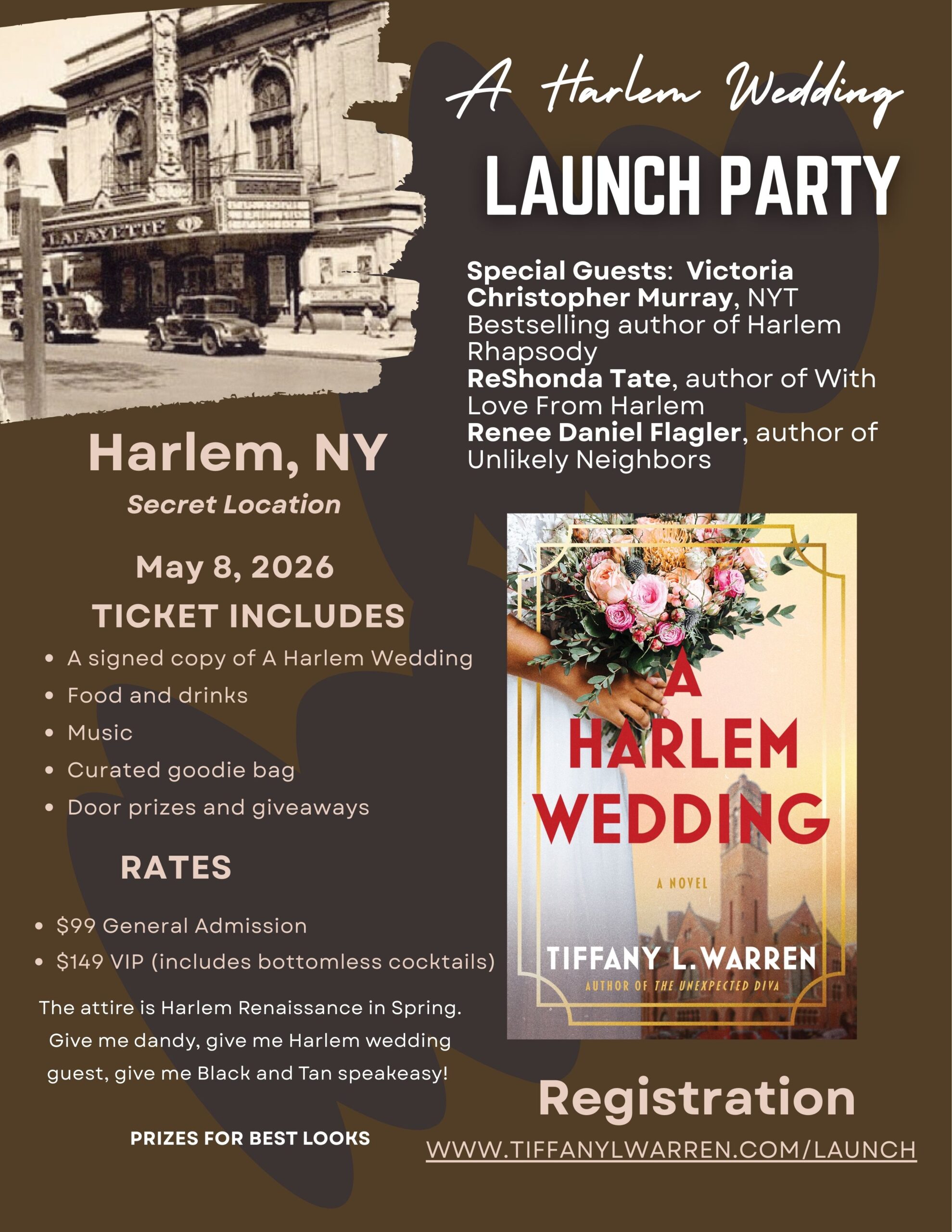 So, put on your best Harlem Renaissance attire and join us! I’m talking Black dandies, Black and Tan clubs, and Spring Harlem Wedding guests. There will be a prize for the best looks!